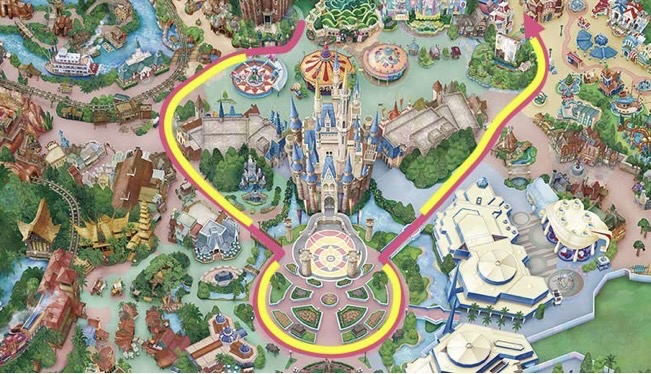 パレードの停止(黄色の線)は3回あるけどシンデレラ城前には停止されないみたい!