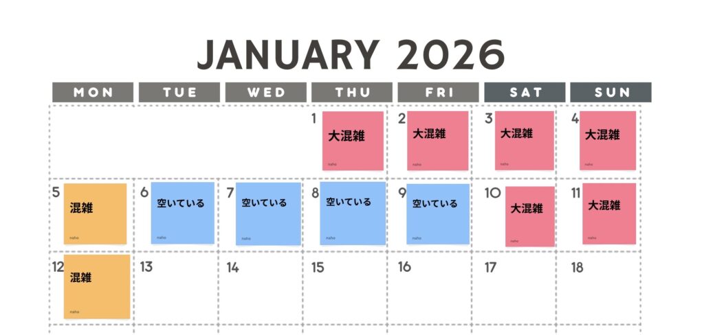 この時期は仕事始めだったり、学生さんだと冬休み明けの学校が始めるタイミングだと思うので比較的に空いていると予想します。