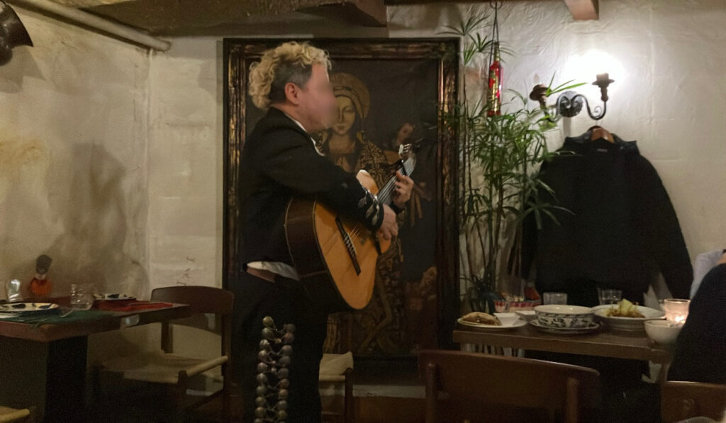 食事をしていると突然、生のラテン音楽が聞こえてきました。1階席じゃなくても2階席でも、席まで弾き語りしてくれる方が来てくれました。
